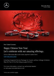 untuk Di hari besar Imlek di 2020 Mercedes Benz Memeberikan Promo special yaitu dengan Down Payment mulai dari 88.000.000,- juta rupiah,